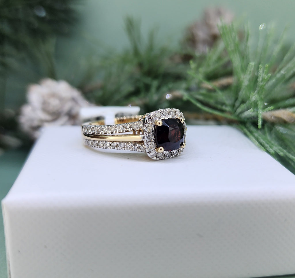 This striking ring is crafted in 14k yellow and white gold and features a vivid 6x6 cushion-cut natural red spinel at its center. The deep, garnet-red hue of the spinel is framed by a sparkling halo of natural mined diamonds, with additional diamonds flowing gracefully along the split shank. With approximately .85 carats of diamonds in total, this ring offers exceptional brilliance, contrast, and timeless sophistication. The ring measures 7mm across the top. Nice and heavy, this ring is 4.30grams