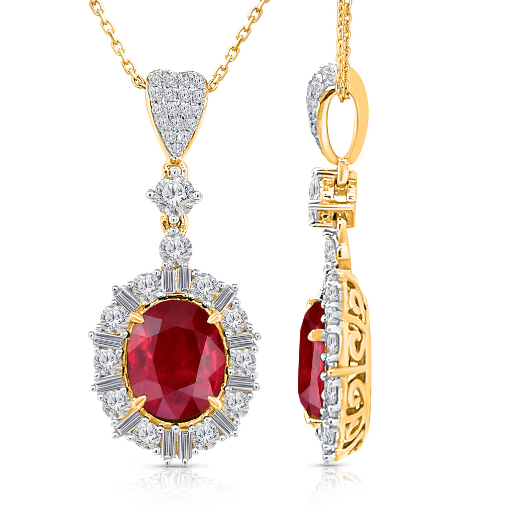Gracefully crafted in 14k yellow gold, this exquisite pendant features a captivating 2.25 carat natural oval cut ruby. The ruby is surrounded by a halo of natural mined diamonds in a combination of round and baguette cuts, adding shimmer, brilliance, and timeless sophistication. Pave set natural mined diamonds complete this piece on the bail. Suspended from an 18-inch 14k yellow gold chain, this pendant is an elegant statement piece designed to be cherished for generations.