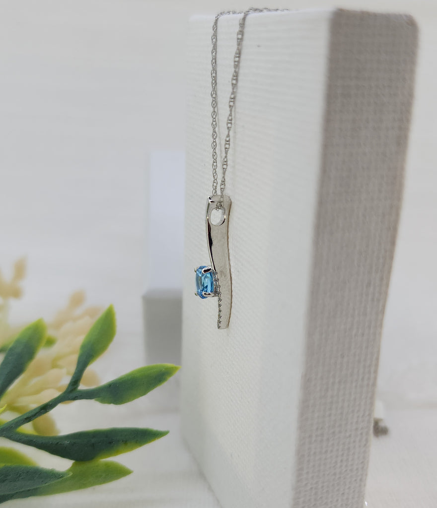 Graceful and modern, this pendant features a 5mm round faceted Swiss blue topaz with vivid color and brilliant sparkle. A curved accent of natural mined round brilliant diamonds totaling .03 carat total weight adds a subtle touch of shimmer and movement.