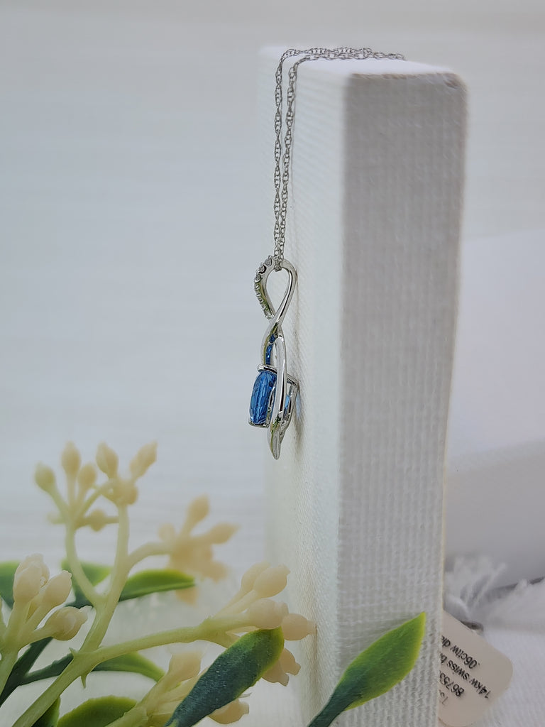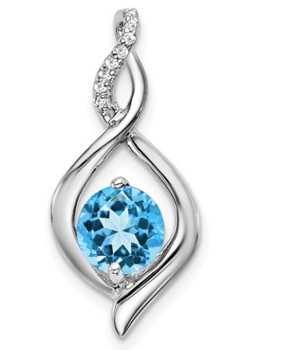 Sleek and gracefully contoured, this pendant features a 6.50mm faceted round Swiss blue topaz with vivid color and brilliant sparkle. The center stone is accented by natural mined diamonds totaling .04 carat total weight, adding a subtle touch of shimmer that enhances the flowing design.