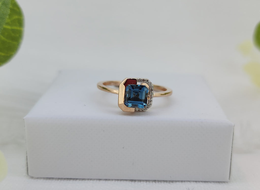 Striking and contemporary, this ring features a .78 carat square step-cut London blue topaz, chosen for its rich deep turquoise blue color and crisp geometric facets. A subtle accent of natural mined diamonds totaling .03 carat total weight adds refined sparkle and contrast.