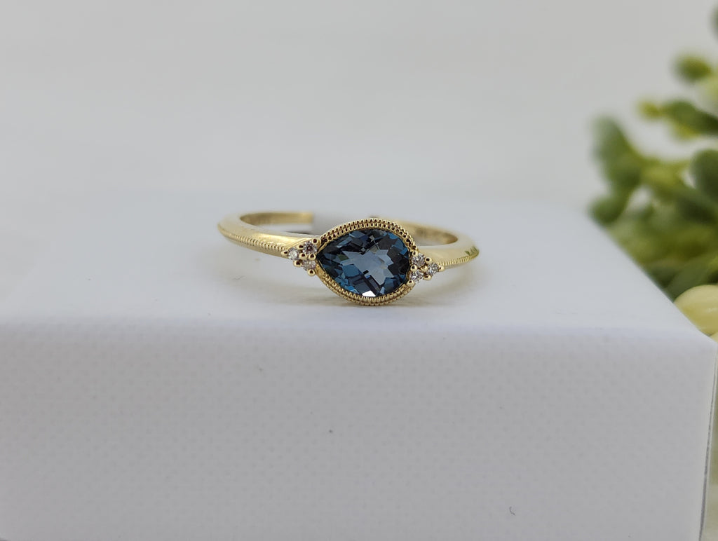 Refined and contemporary, this ring features a .66 carat pear-shaped London blue topaz, prized for its deep, turquoise blue hue. The gemstone is framed in a milgrain bezel, with additional natural mined diamond accents totaling .03 carat total weight, adding subtle sparkle and texture.