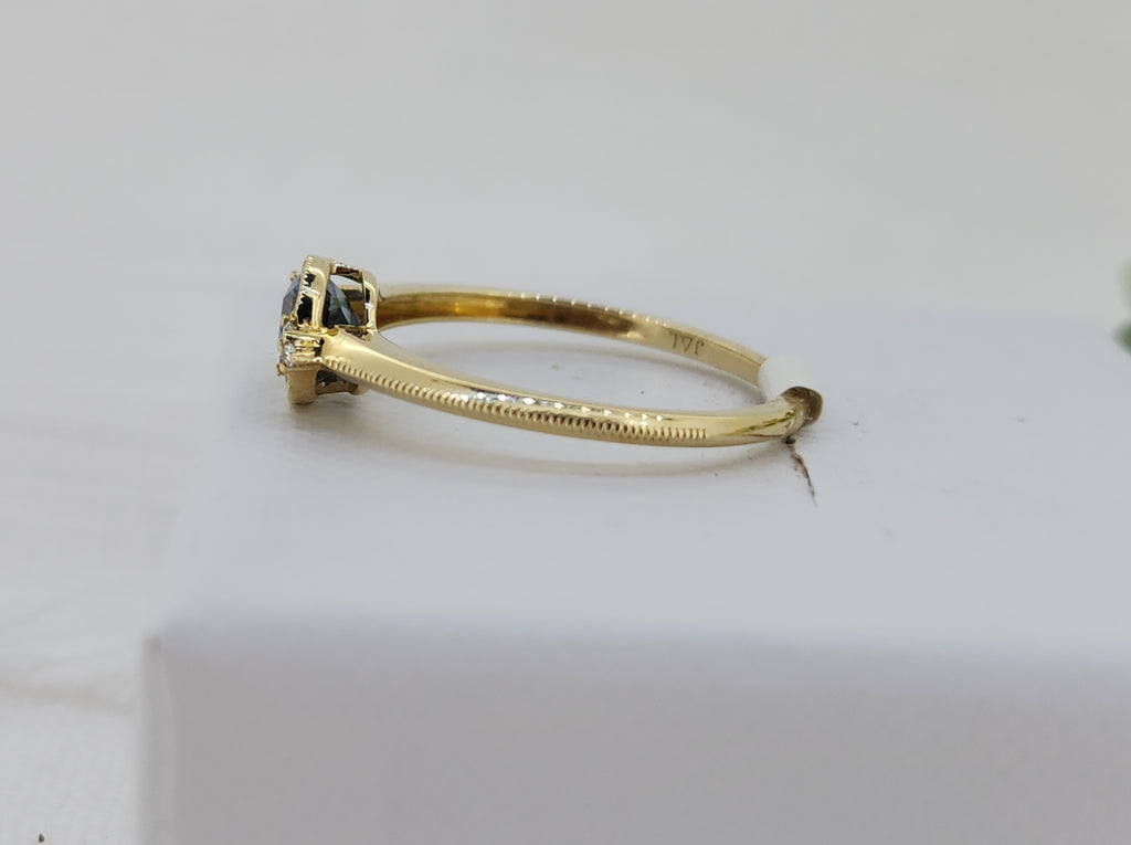Crafted in 14K yellow gold, the ring showcases a milgrain knife-edge design that gives it a distinctive modern design. Measuring 6.20mm across the top and tapering to a slender 1.10mm shank, this low-profile ring is designed for comfortable wear. With a total weight of 1.8 grams including the stones, it is delicate, modern, and effortlessly elegant.