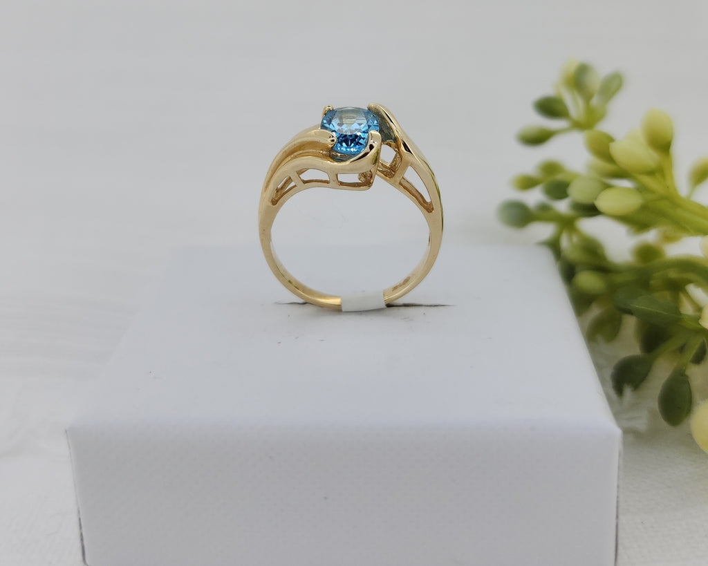 Modern and effortlessly wearable, this ring features a 7.91 × 5.85mm oval Swiss blue topaz, showcasing vivid color and elegant faceting. The gemstone is set in a sleek 14K yellow gold design with smooth, sculptural lines that create a contemporary look.