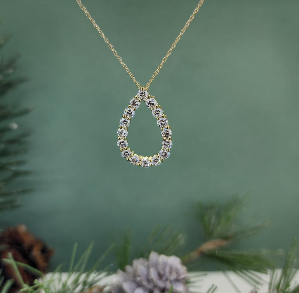 (16) Sixteen beautiful lab grown diamonds form a tear drop shape pendant. The total diamond weight is 1.00cttw. Stunning piece that measures 20mm in length and is hung on an 18" inch yellow gold whisper chain