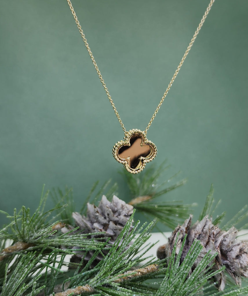 Stunning 14k yellow gold fluted clover necklace attached on each side to an 18" inch adjustable chain. The clover measures 14.45mm wide and 14.67mm high. Reversible! Wear with high polish side out or fluted. Nice heavy piece weighing in at 3.2grams